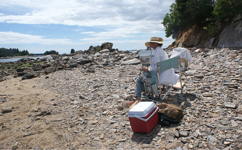 In this photo I had set up to paint on a rock strewn beach in Muscongus Bay. High tide will swallow the entire beach and erase any trace of my visit.